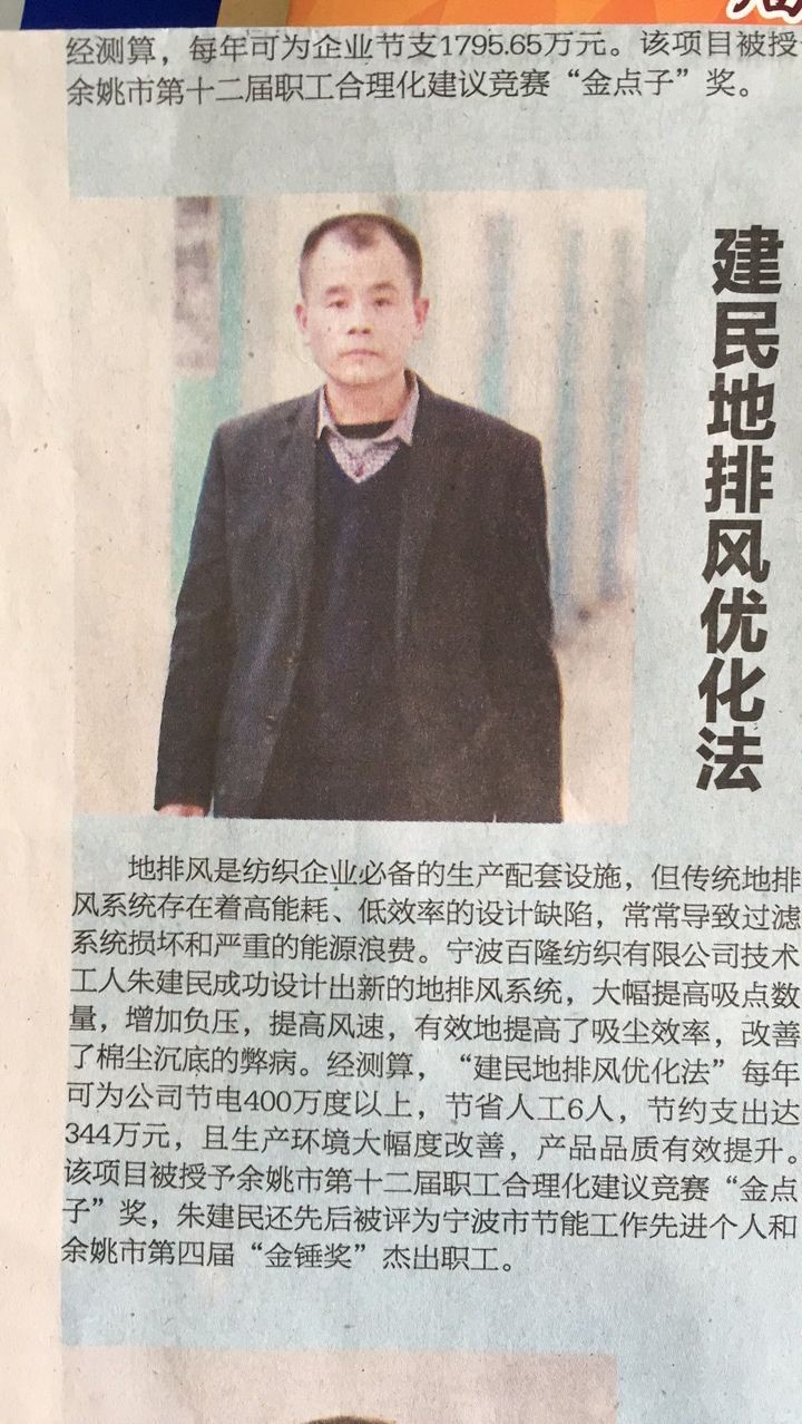 在今年“五一”劳动节期间,公司不时传来企业及员工获奖的喜讯。如为表彰百隆东方一贯坚持的争创精品战略及成效,企业荣获宁波市总工会颁发的“宁波市五一劳动奖状”;同时,百隆旗下宁波百隆技术工人朱建民则因成功设计出新的地排风系统,项目被命名为“建民地排风优化法”。该排风优化法通过大幅提高吸点数量,增加负压,提高风速,有效提高了吸尘效率,并改善了棉尘沉底的弊端。经测算,“建民地排风优化法”每年可为公司节电400万度以上,节省人工6人,节约支出达344万元,且生产环境大幅改善,产品质量有效提升。该项目被授予宁波余姚市第十二届职工合理化建议竞赛“金点子”奖,朱建民还被评为宁波市节能工作先进个人和宁波余姚市第四届“金锤奖”杰出职工。